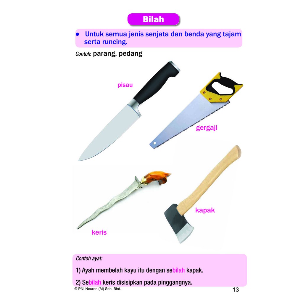 Penjodoh bilangan bagi pisau (keris, pedang, . Helai * digunakan untuk membilang benda yang lembut,lebar dan pakaian . Batang, benda panjang atau tinggi, sebatang sungai . 1 tiga bilah parang yang tumpul itu telah diasah oleh salim. Baris, untuk kedudukan benda/manusia yang berbaris, orang, kedai, rumah, pokok, tulisan, ayat, meja, kerusi ; ~ pisau itu terjatuh di atas tanah; Emak menggunakan sebilah gunting untuk menggunting kain. Untuk benda ditusuk dengan lidi, bilah buluh, dll. Angkatan, kumpulan seragam, seangkatan tentera ; Baris, kumpulan benda dalam bentuk garis lurus, sebaris ayat ; Ayah menggunakan sebilah kapak untuk menebang pokok yang tumbang. Benda tajam, runcing seperti pisau, jarum, golok, tombak,. Tujuan blog ini dibina hanyalah untuk memberi maklumat tentang tajuk penjodoh bilangan. Benda yg menyerupai bilah buluh dll (pisau, keris, dll):
